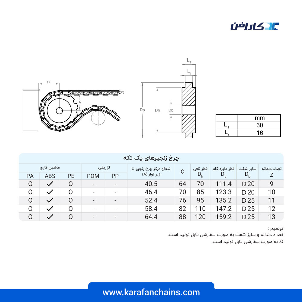 | جدول مشخصات فنی زنجیر تخت چرخشی پلیمری گام 38.1 میلیمتر عرض 101.5 میلیمتر - ضد اسید | |