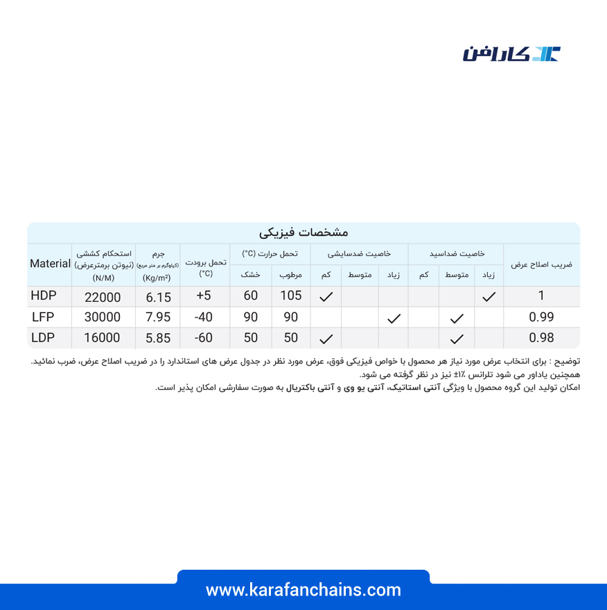 | جدول مشخصات فنی تسمه مدولار چرخشی ( اسپیرال ) گام 1 اینچ جدید { سفید } | |