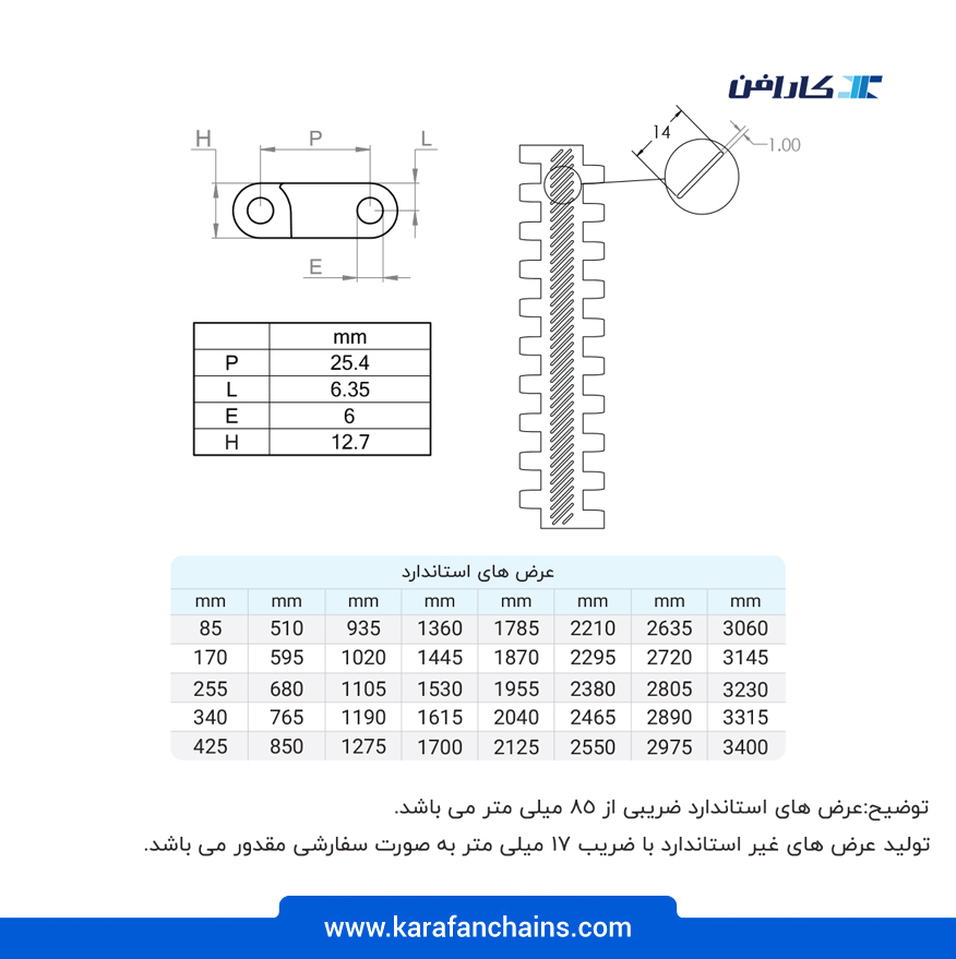 | جدول مشخصات فنی تسمه مدولار حرکت مستقیم گام 1 اینچ با گذر 10٪ سنگین کار | |