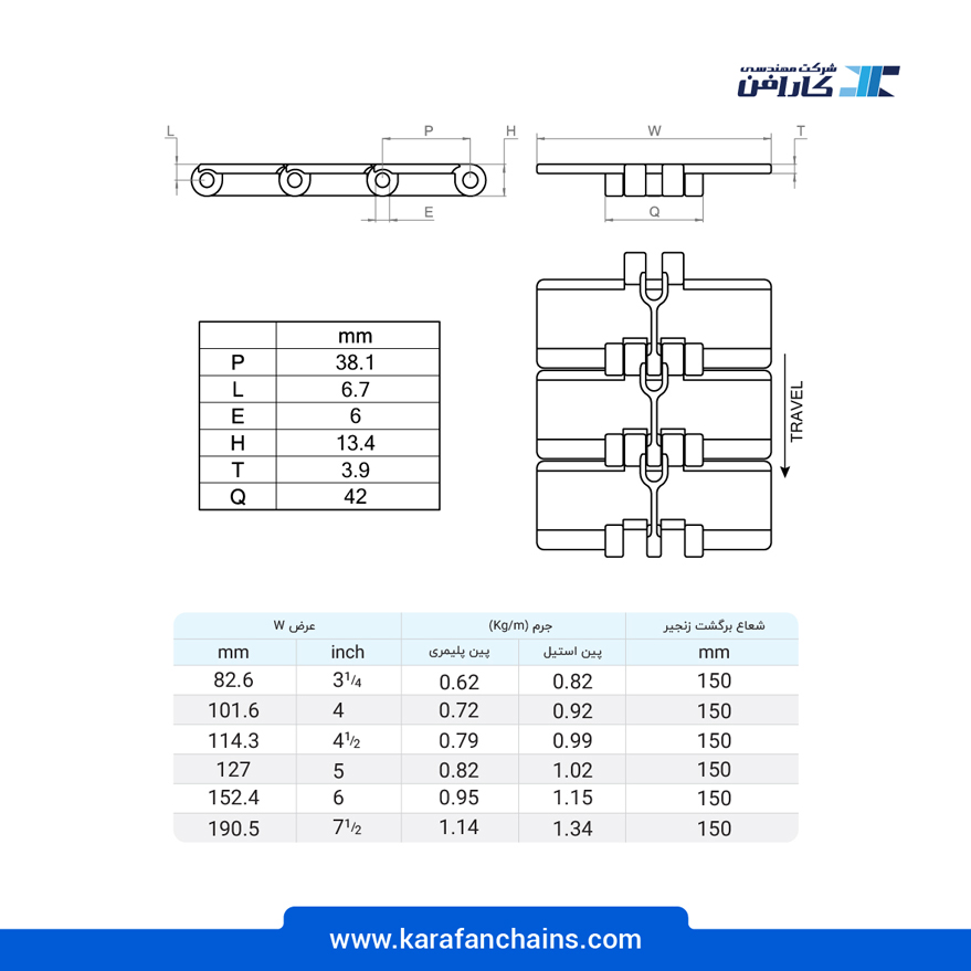 این محصولات در رده بندی در دسته زنجیرهای تاپ چین ها (TOP CHAINS) قرار می گیرد و اصولاً نباید تحت کشش کار کنند. پیشنهاد می شود با توجه به طول کانوایر از مدلهای معرفی شده کارافن در خصوص برگشت زنجیر و نوع کشش استفاده گردد.