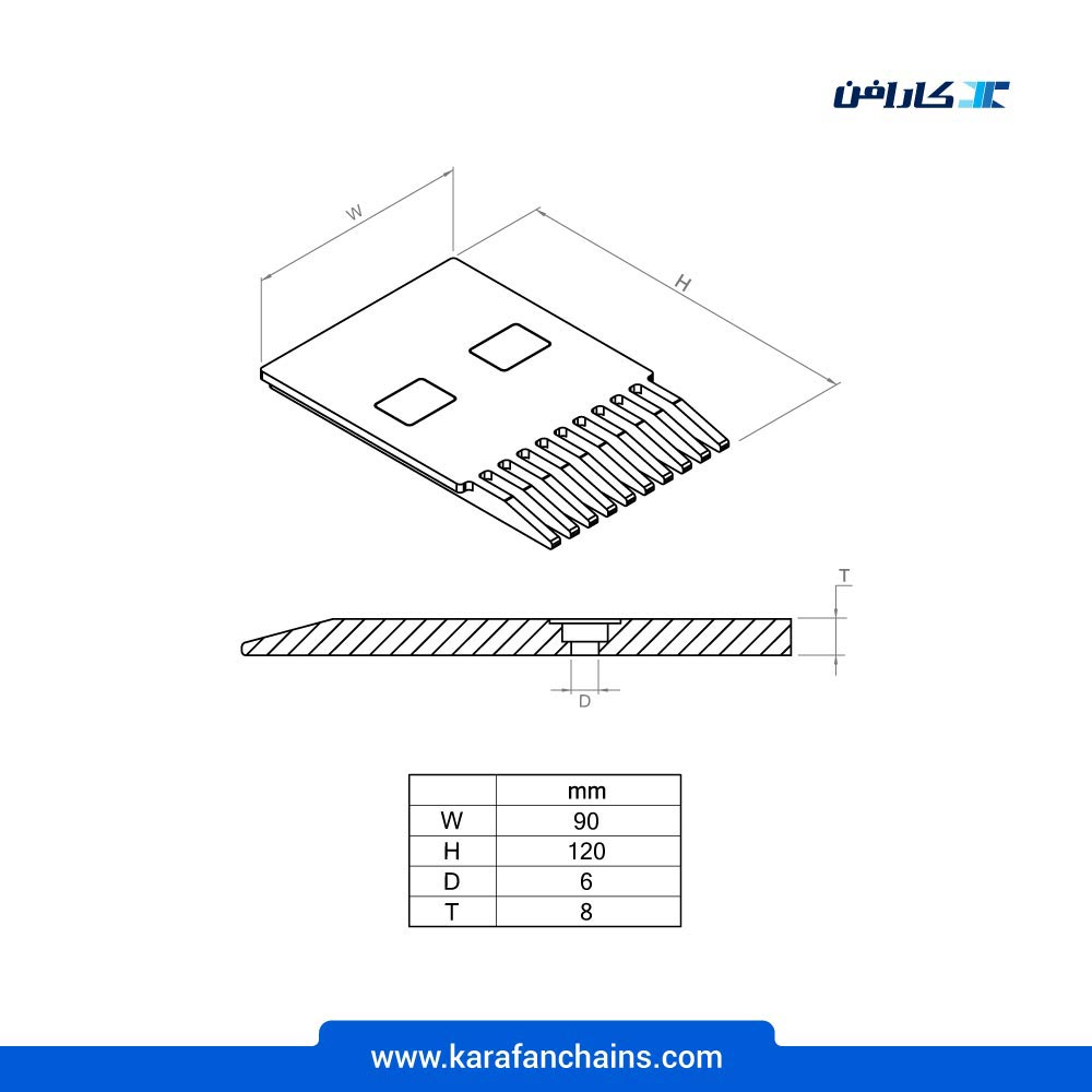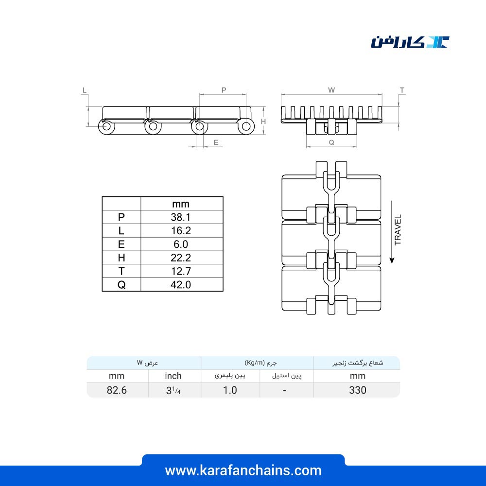 | جدول مشخصات فنی زنجیر تخت حرکت مستقیم پلیمری گام 38.1 میلمیتر عرض 82.6 میلیمتر ( شانه ای ) | |