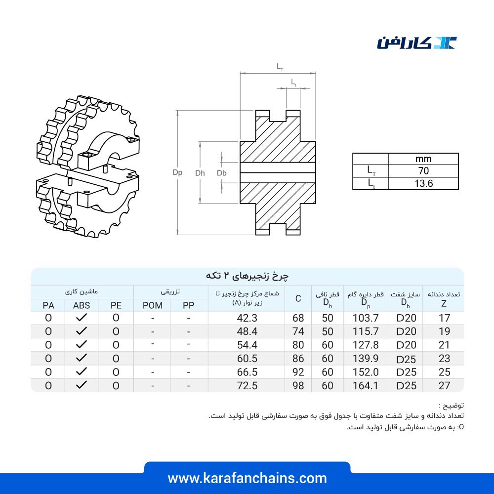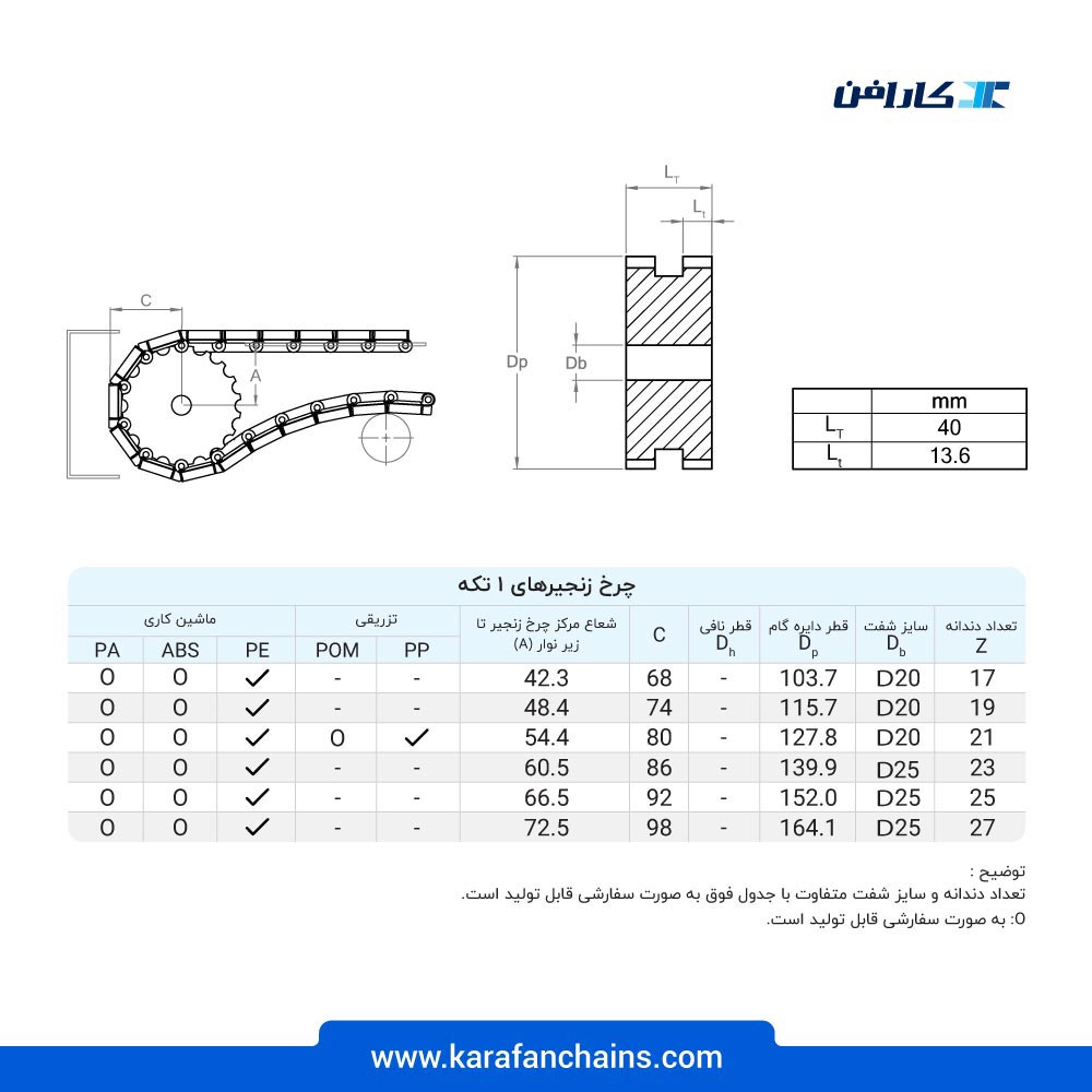 چرخ زنجیرهای این گروه محصول در دو نوع یک تکه و دو تکه در جداول فنی معرفی شده است.